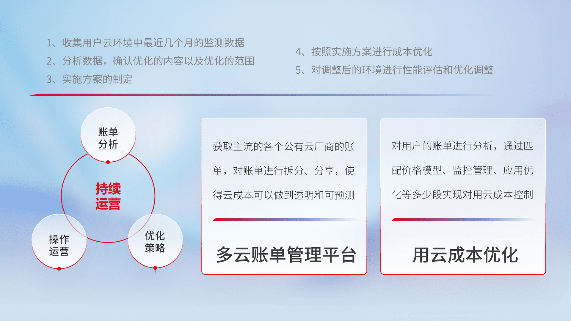 通过多云纳管,,,以统一的资源数据模型把客户的云资源进行抽象和封装,,进而实现对多云资源的统一操作,,保障云资源管理的可靠性、、稳定性与可用性。。。。量身定制化运维内容,,,配置、、、开发运维、、、补丁管理、、、备份、、监控、、、认证和访问管理、、审计和日常巡检等,,保障在用云过程中的可靠度,,,稳定度以及高可用率。。